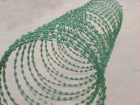 刀片刺繩也稱為刀片刺絲、刀片刺網(wǎng),是一種新型防護(hù)網(wǎng)。刀片刺網(wǎng)由熱鍍鋅鋼板或不銹鋼薄板沖壓出尖銳的刀片狀,高張力鍍鋅鋼絲或者不銹鋼絲做芯線組合而成的阻絕器材。由于刺網(wǎng)造形獨(dú)特不易觸摸,因而能達(dá)到極好的防護(hù)隔離效果.刀片刺繩按照安裝方法不同可分為:(蛇腹式) 螺旋式刀片刺繩,直線型刀片刺繩,平板式刀片刺繩,刀片刺繩焊接網(wǎng)等。刀片刺繩大略分為螺旋型、直線型、螺旋交叉型三種形式。